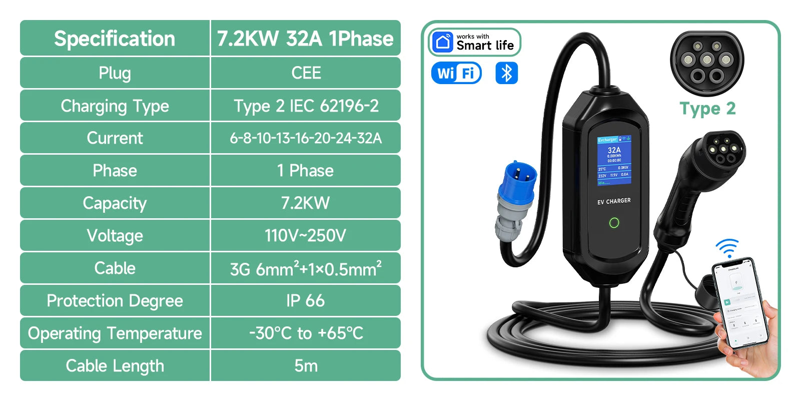 AFYEEV 32A 7.2KW Type2 Type1EV Charger Portable GB/T Electric Vehicle Charger EVSE Charging Cable WiFi Bluetooth APP Control