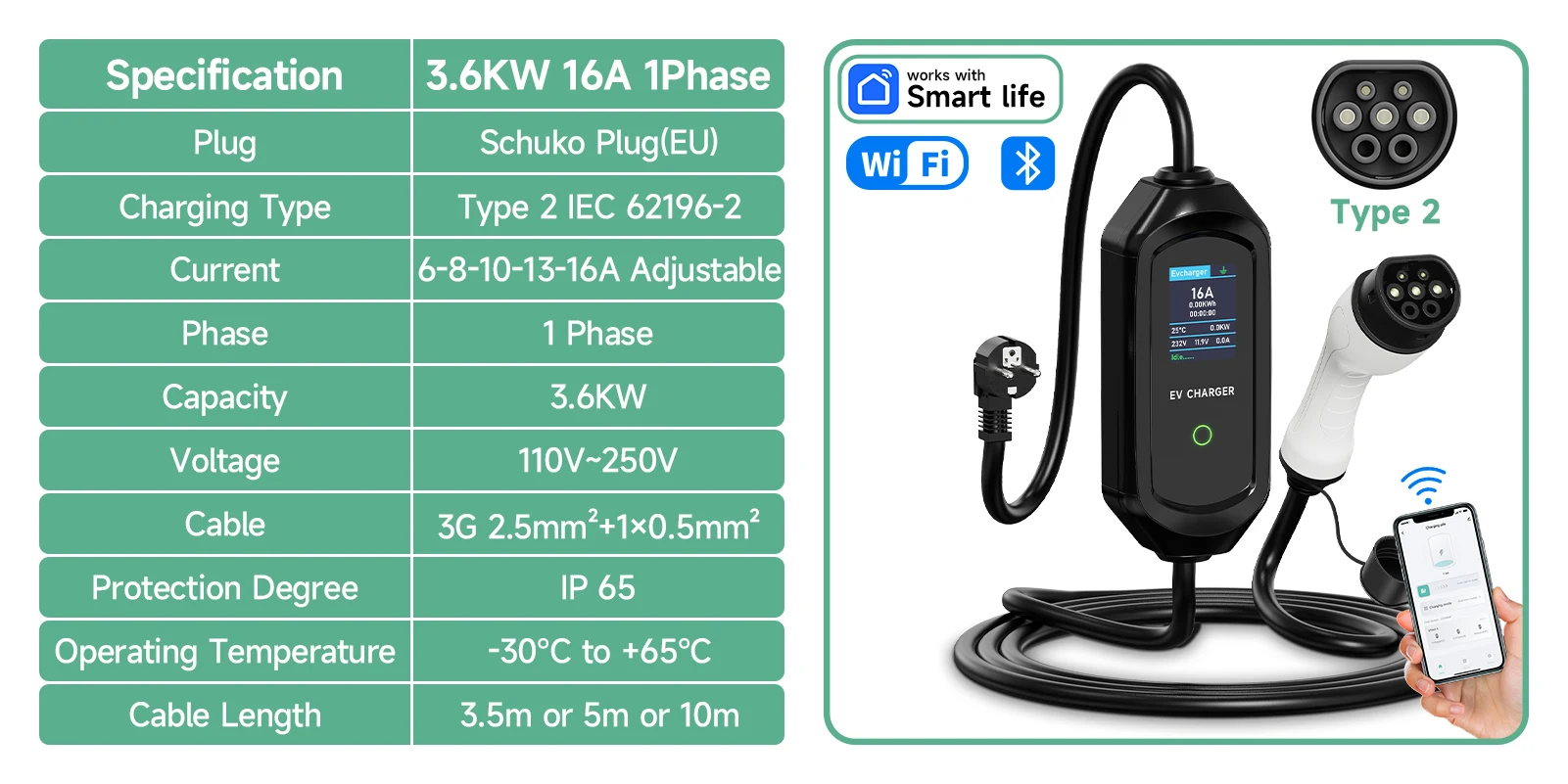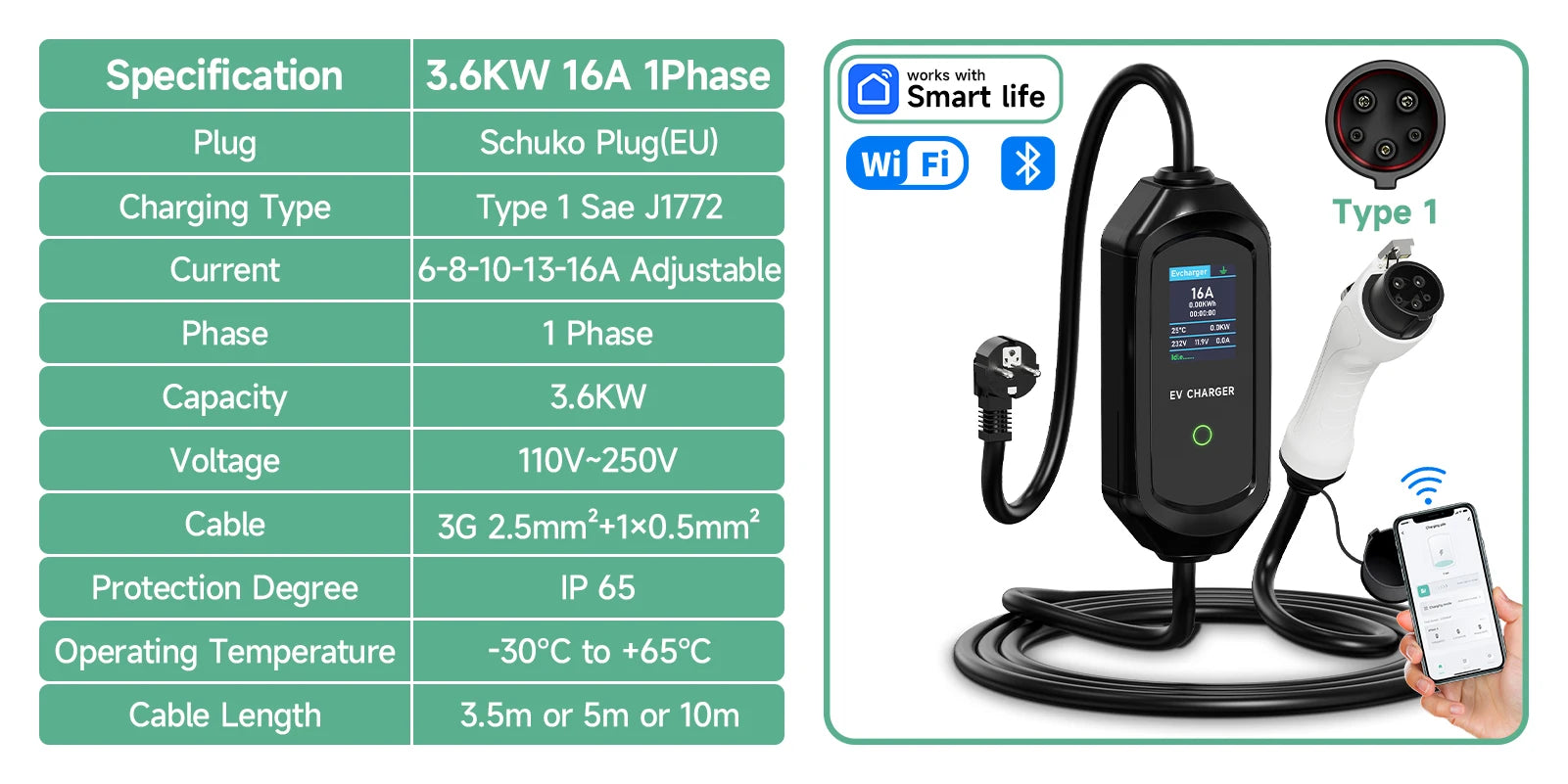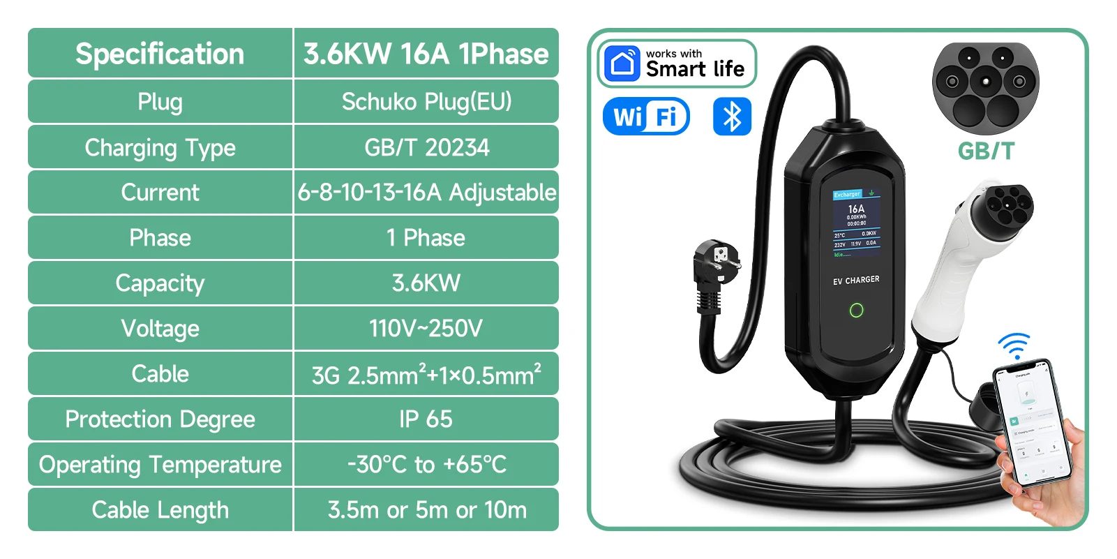 This EV charger can adjust the current of 6A/8A/10A/13A/16Amp, to reach a max output power up to 3600W. Making EV car charging faster! (Note: The actual charging time of an electric car comes down to the following two: the power source and the vehicle's on board charger capacity.)
