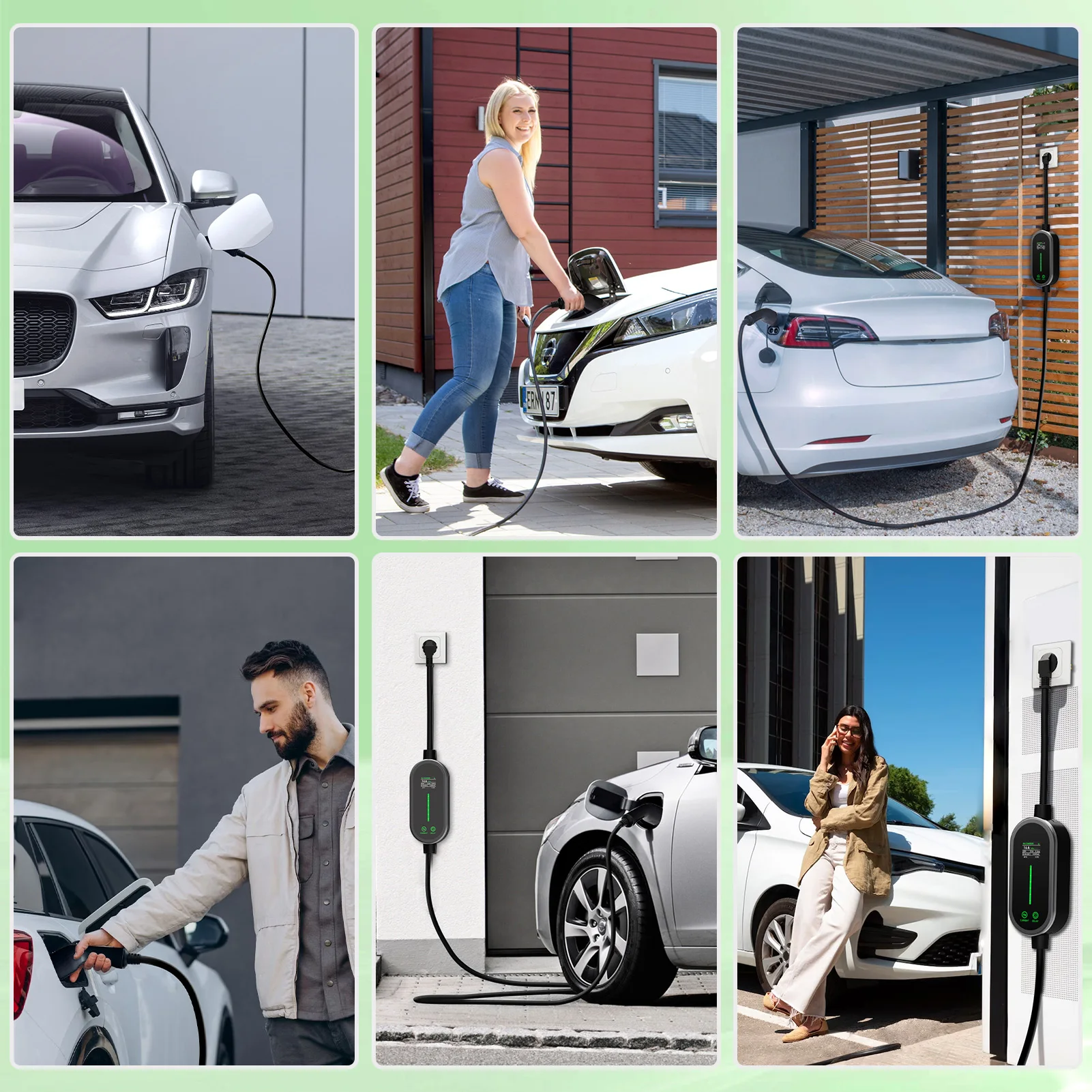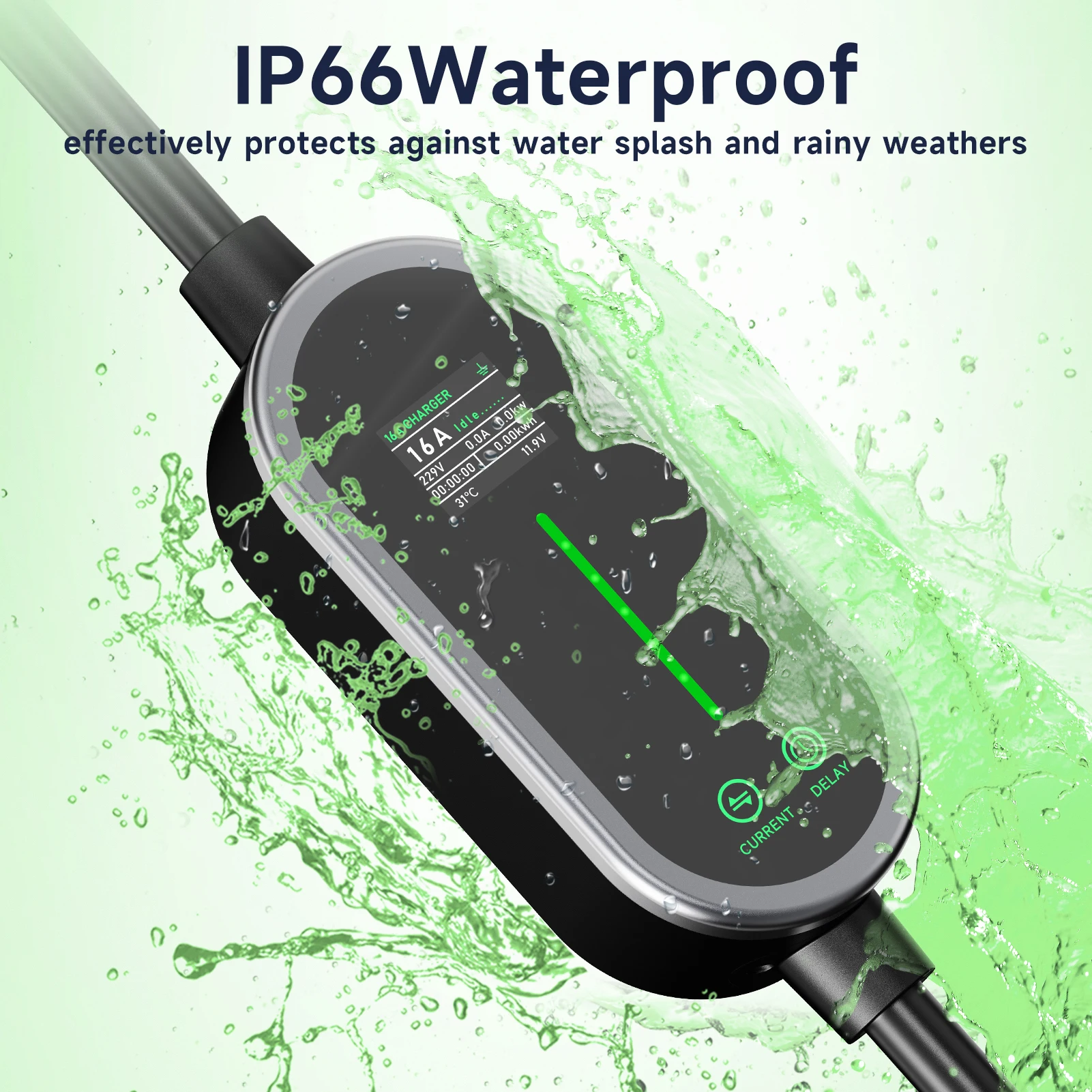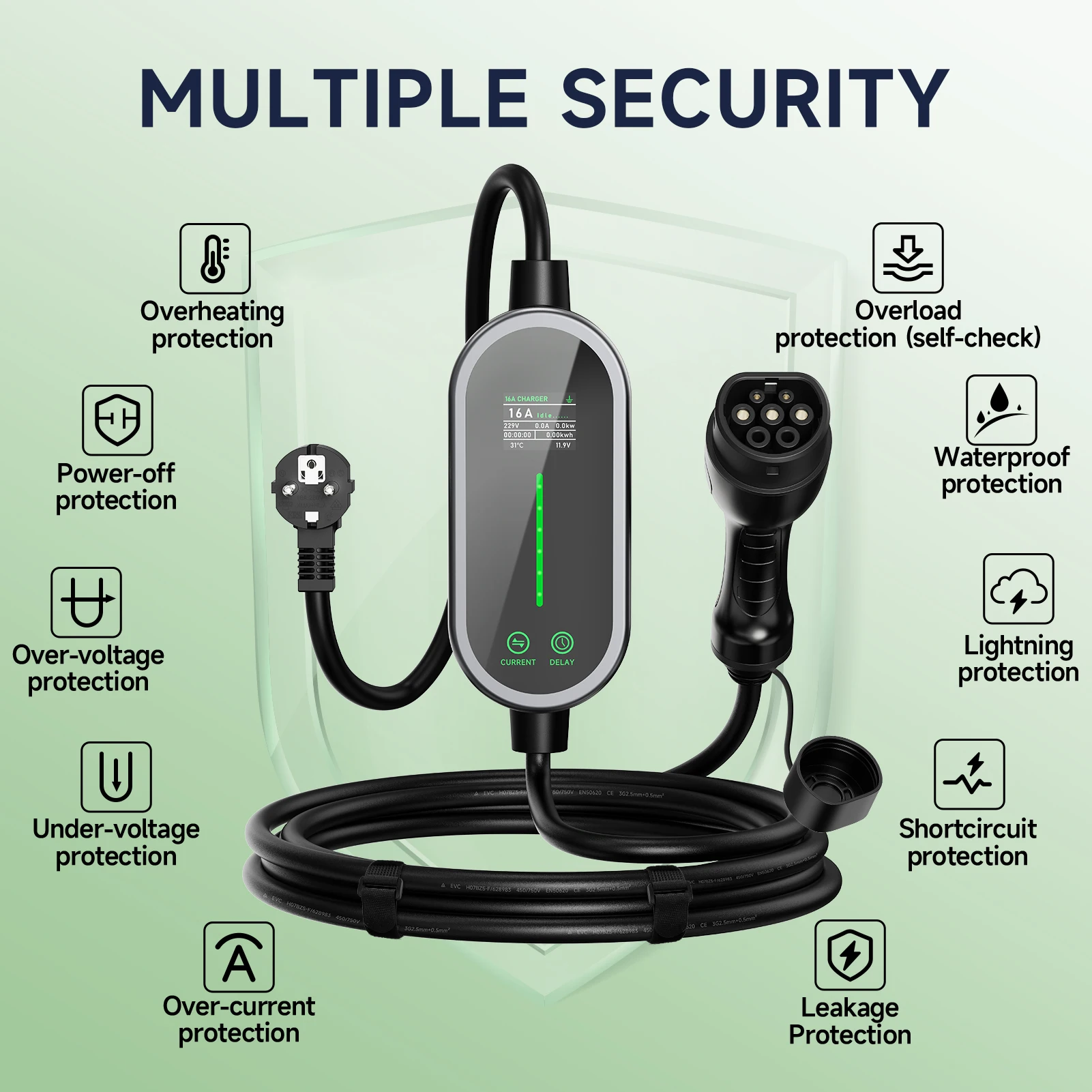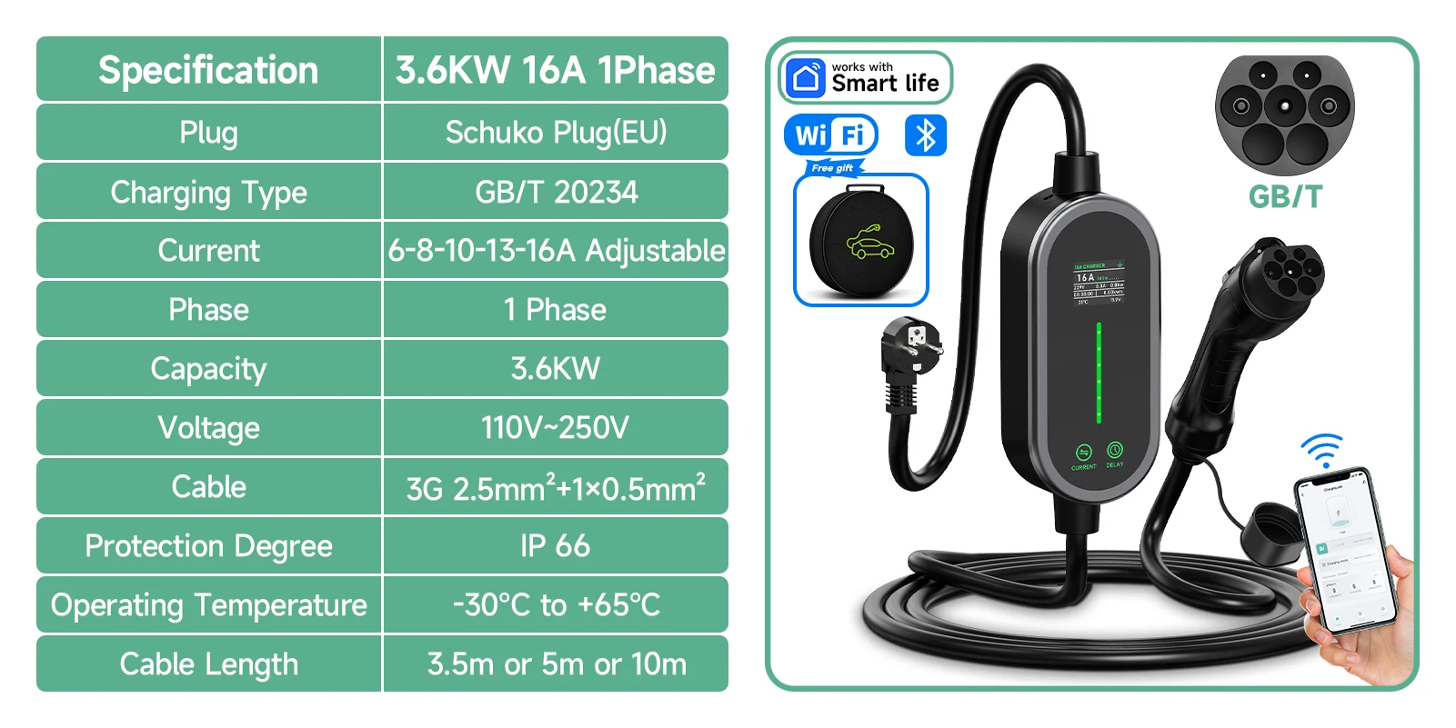 This EV charger can adjust the current of 6A/8A/10A/13A/16Amp, to reach a max output power up to 3600W. Making EV car charging faster! (Note: The actual charging time of an electric car comes down to the following two: the power source and the vehicle's on board charger capacity.)