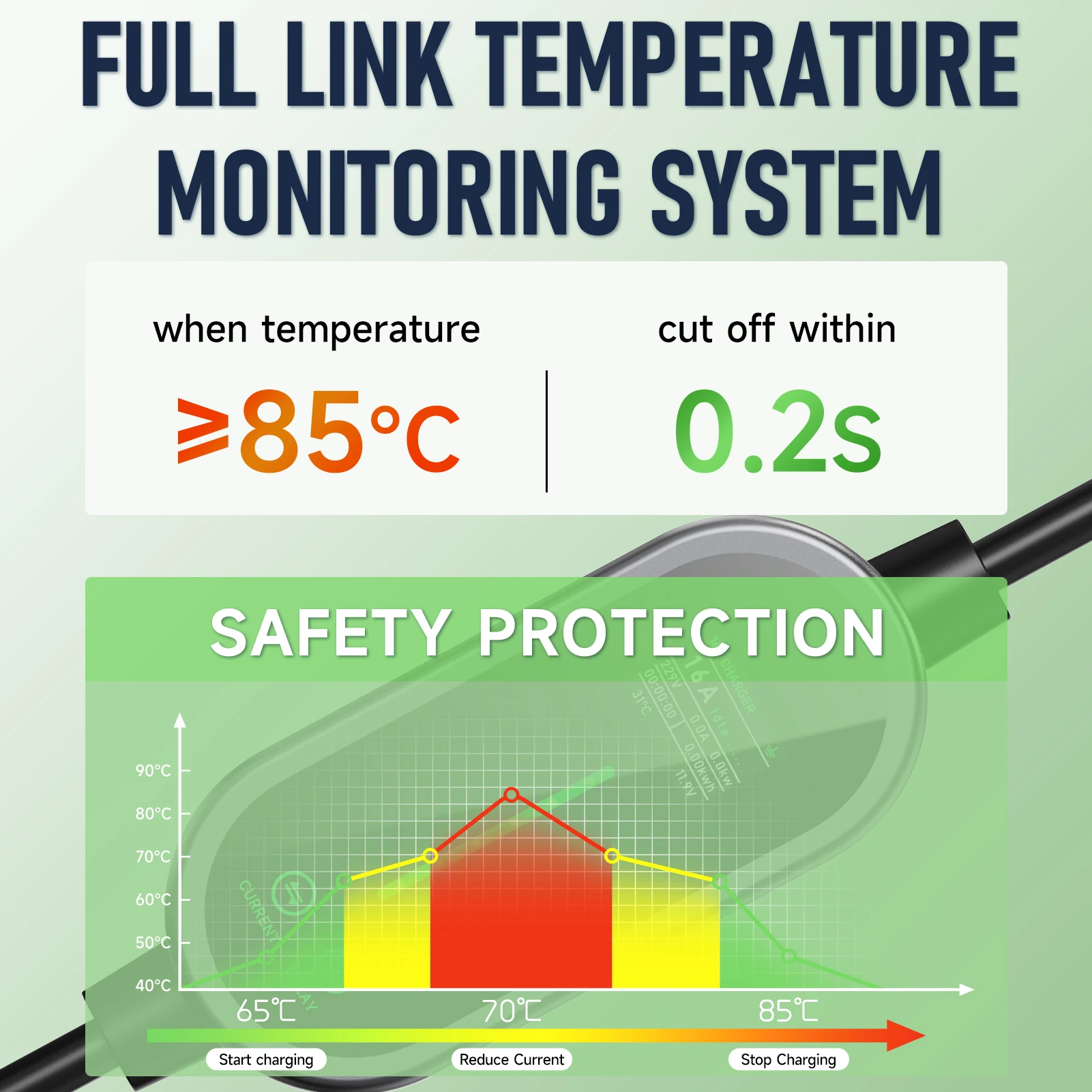 Safety is a top priority for us when it comes to charging the electric vehicles. Our EV charger is designed with multiple protection systems such as, lightning-proof, leakage protection(TypeB AC30mA+DC6mA) , over-voltage, overheat protection, over-current protection, ground protection, and more. The cable is made of high-grade, rugged TPU materials, and the connector features IP65 waterproof & dust-proof protection to make this home EV charger safer and more reliable.