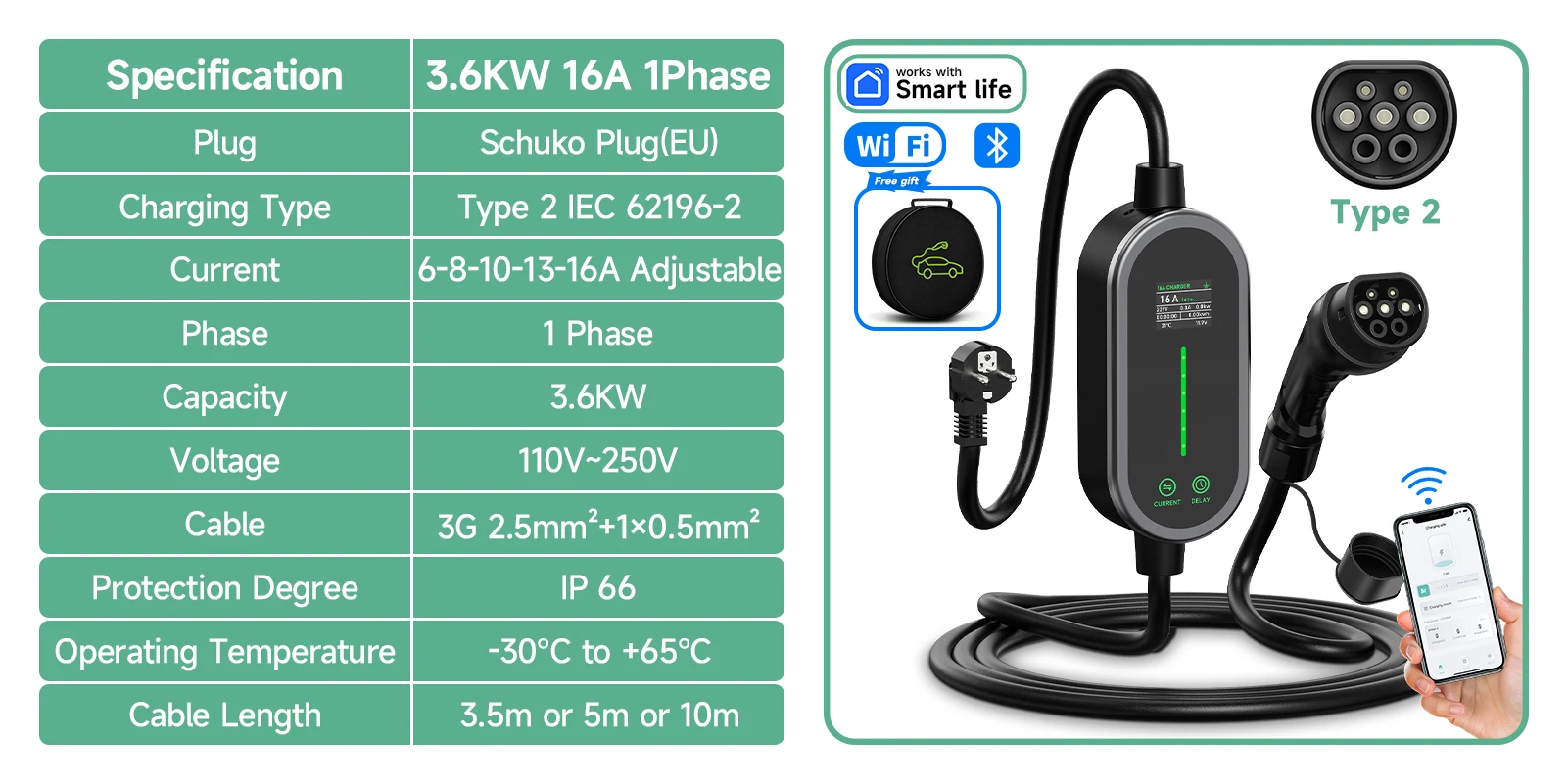 AFYEEV 3600W Portable Type2 IEC62196-2 EV Charger Type1 SAE J1772 Electric Car Charger GBT EVSE Charging Cable Wallbox EU Plug