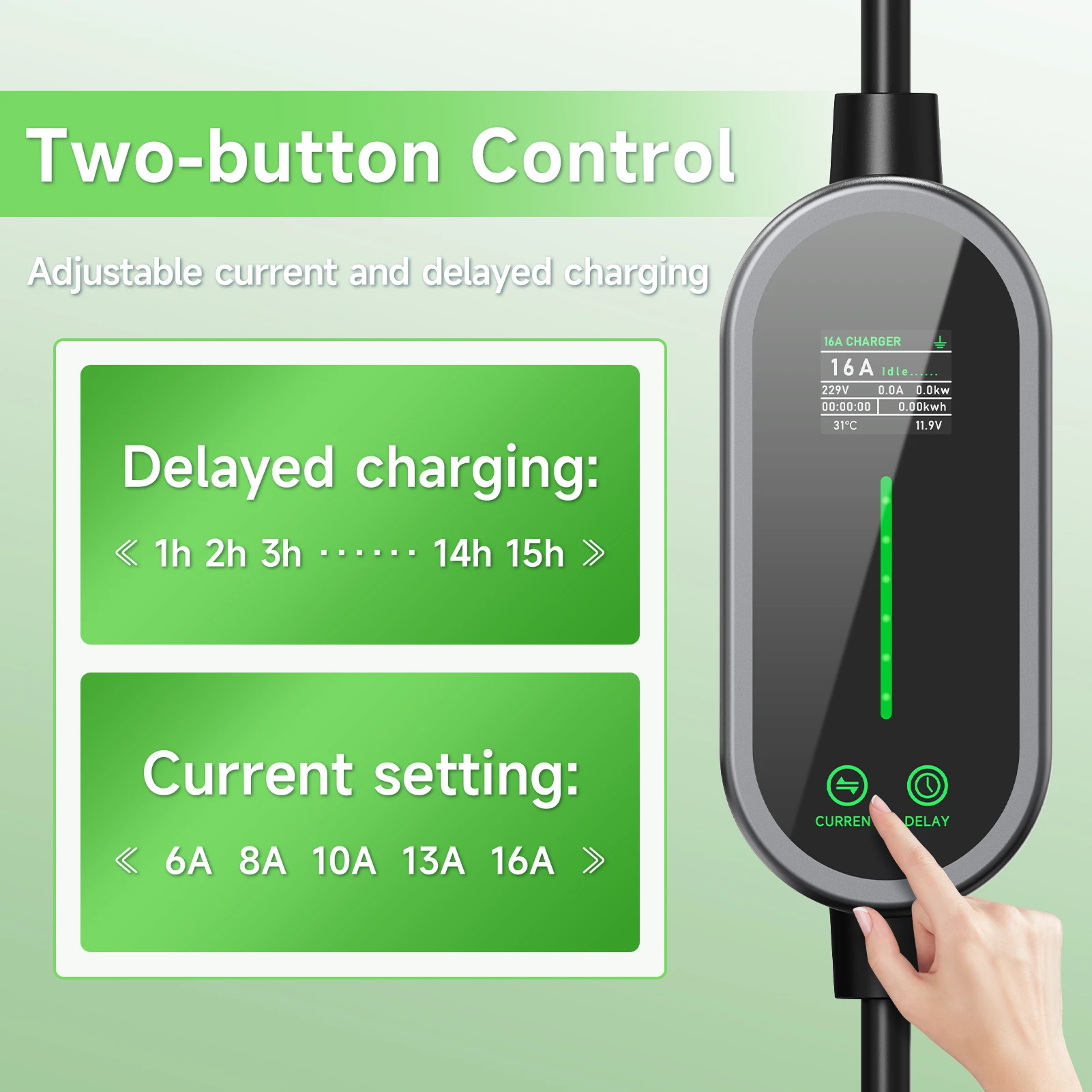 You can set the charger to start charging at your desired time by pressing the delay button. Great for overnight charging, and charging during off-peak hours costs less than charging during the day. Set it up before bed, and the next morning you'll have a fully charged car to start your day. Once charging is complete, you can plug it into a power source without any issues. Once fully charged, our charger will automatically power off.