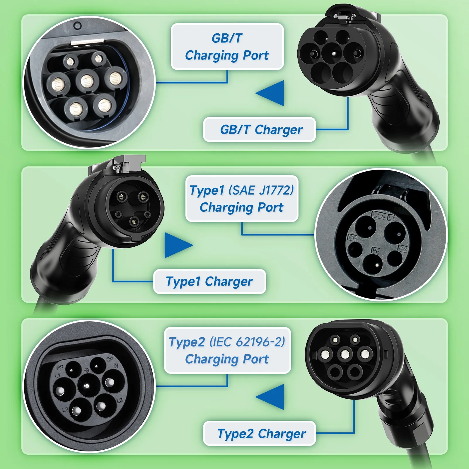 There are three types of car chargers: type1, type2, and gbt. Please check if your option is the type of charger you need before placing an order. If you have any questions, please contact me and I will help you solve it.