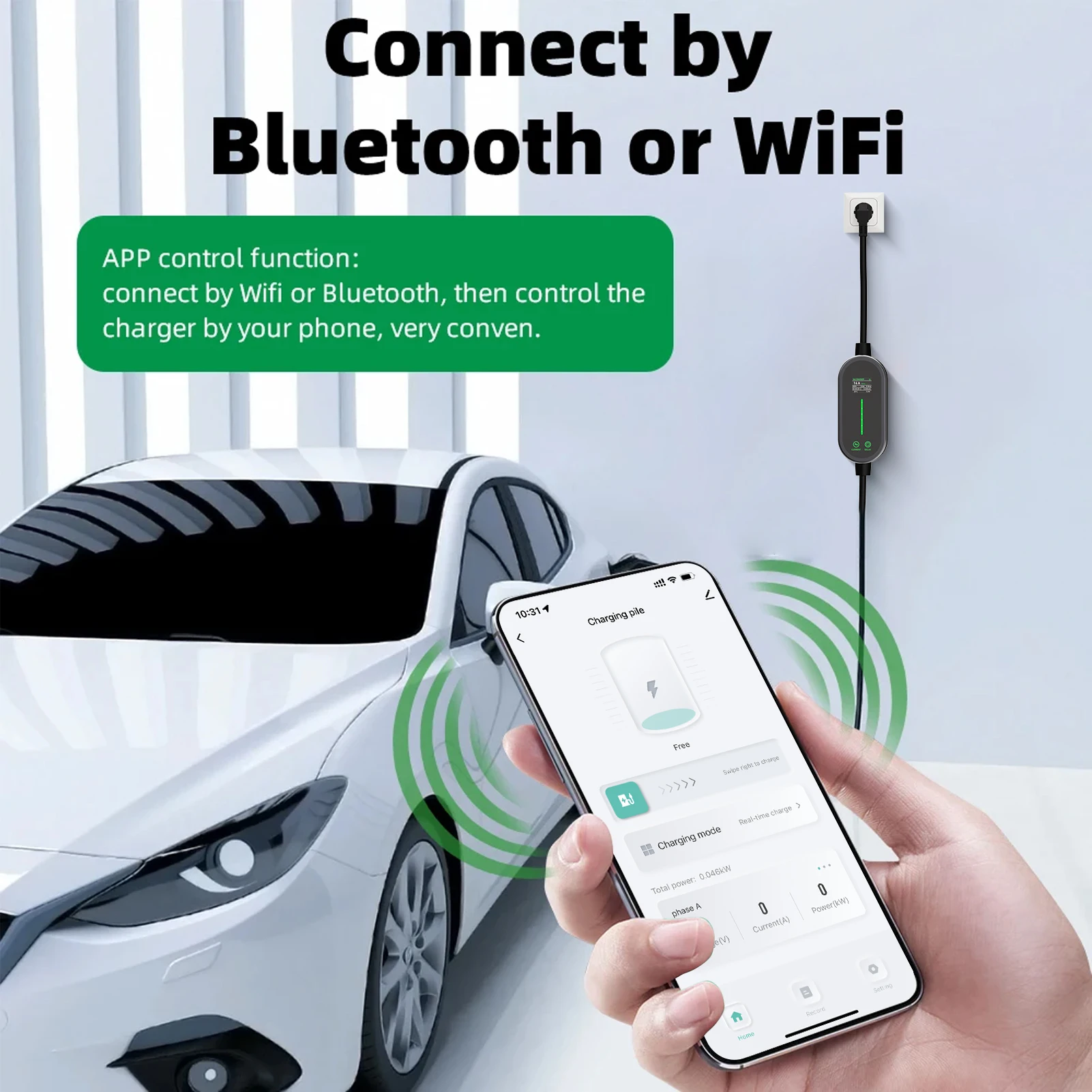 Built-in smart APP(turn on the wifi and bluetooth when add your device), you need to connect under WIFI environment, which allows your vehicles to be charged during off-peak period by setting the charging time, save money on the electricity bills. And it allows to adjust charging current range from 6A to 16A, track the charging status.