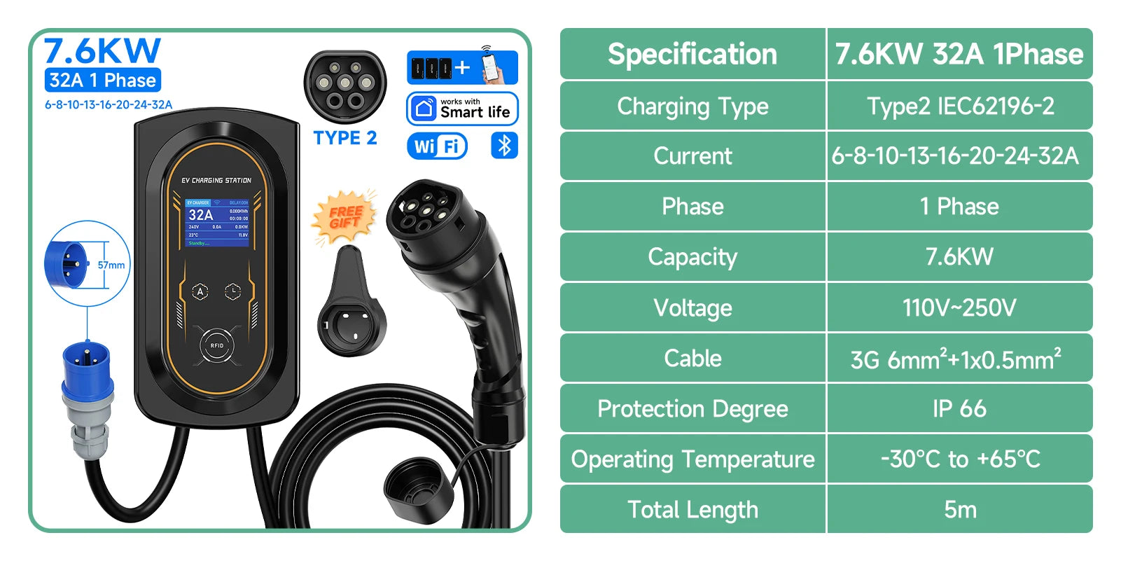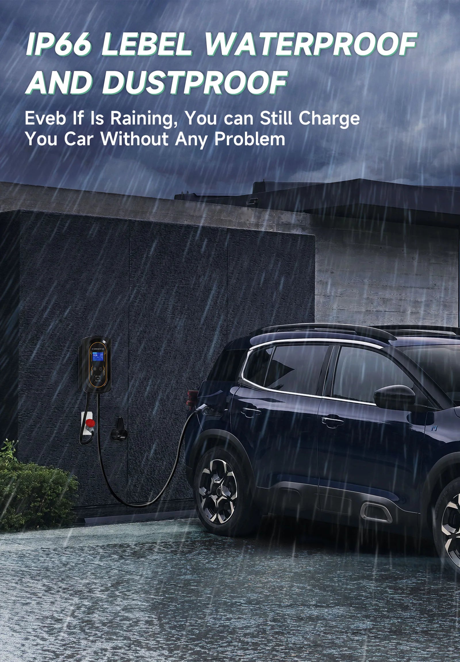 The charging station is designed with IP66 charging case and gun head, which can withstand dust, water and even low pressure water jets! The charger has over-current, over-voltage, under-voltage and leakage protection (Type A+DC 6mA), and it will automatically turn off after full charge. And obtained the certification requirements IEC 61851 | IEC 62196 | CE | EMC | RoHS | TÜV.