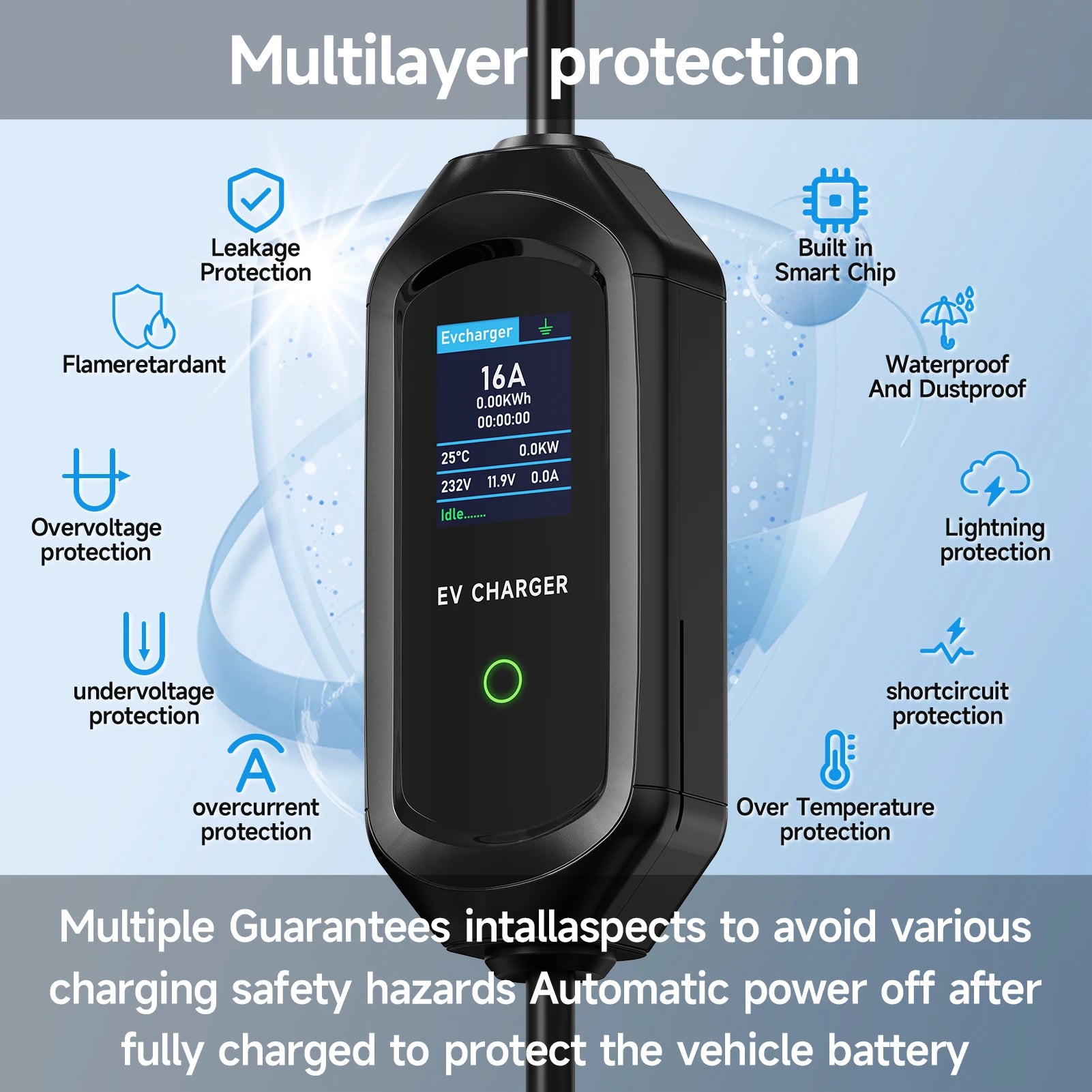 • Quick & Easy Operation: When you are traveling or visiting relatives and friends, you don't have to worry about charging, because our chargers can be carried with the car and you can check every charging data by OLED screen on the charger. Simply connect the plug with the EV inlet, and then the charger will automatically detect the connection status and start charging.
