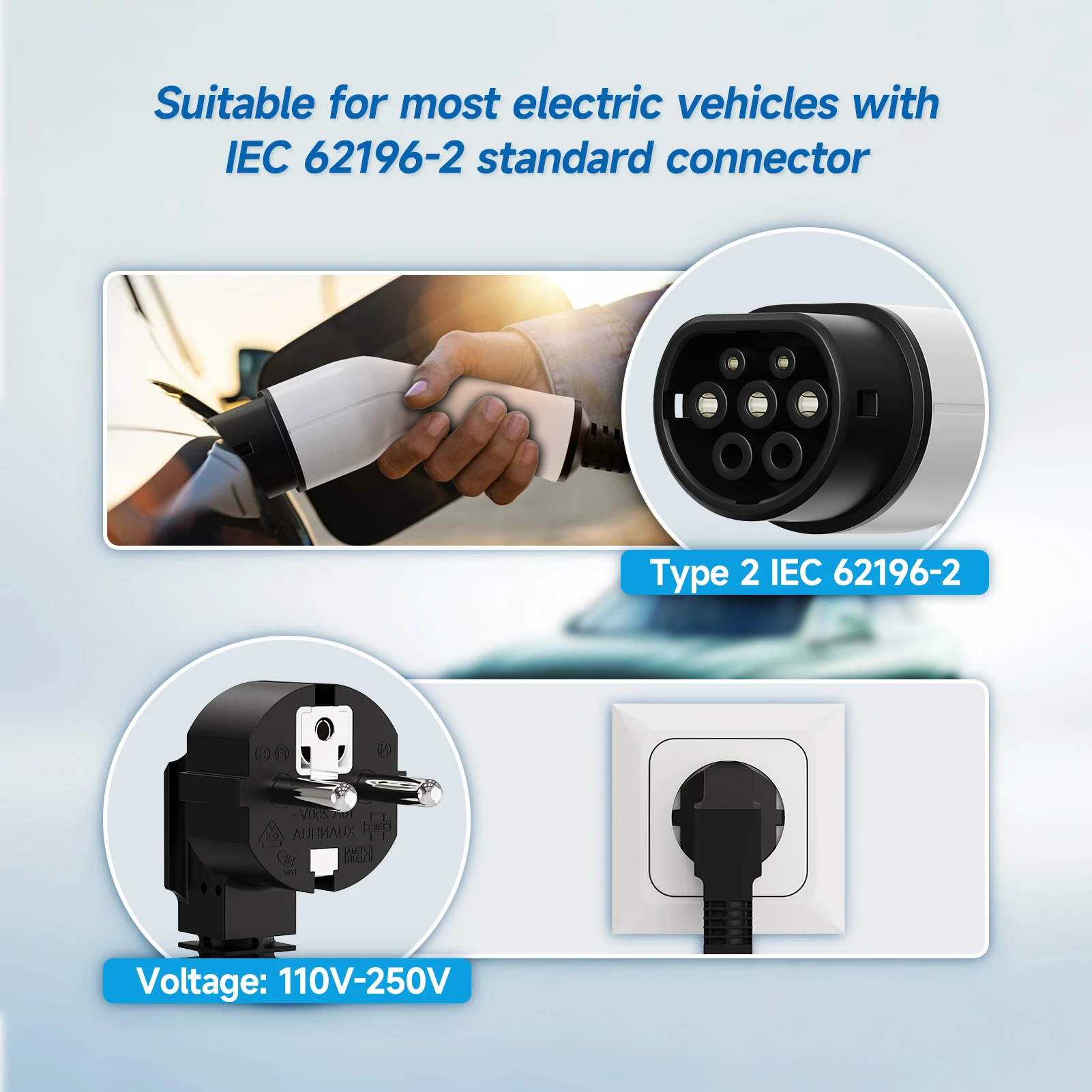 Fast Charging: Designed to make EV charging quick and effortless.Utilizing the standard type1, type2 and gb/t charging protocol, this charging cable is compatible with all electric cars and plug-in hybrid. Compact and durable, it is the perfect charging cable for home use and with the cable that is long enough for most driveways or garages.