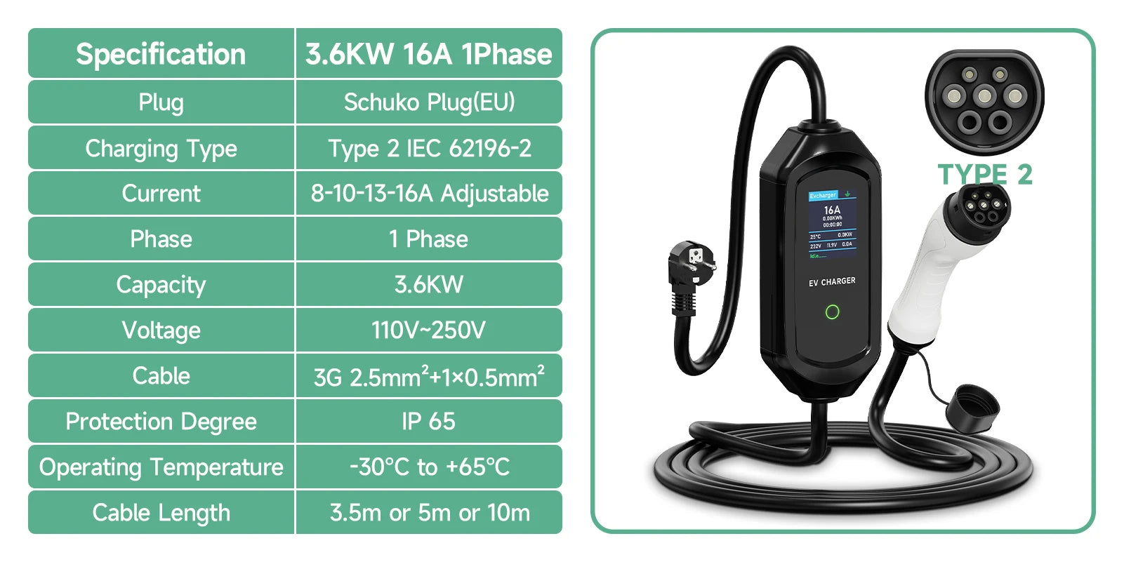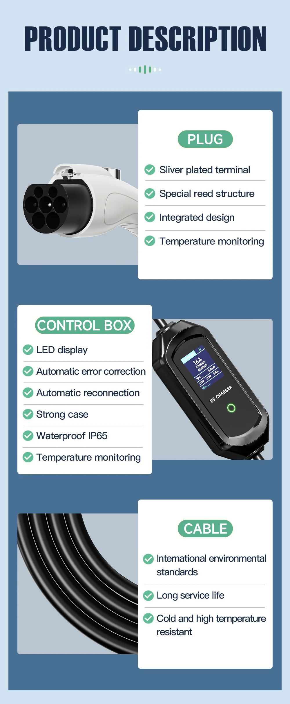 AFYEEV Portable Type2 IEC62196-2 EV Charger 16A GB/T EVSE Charging Cable Type1 SAE J1772 EU Plug Controller Wallbox for Car