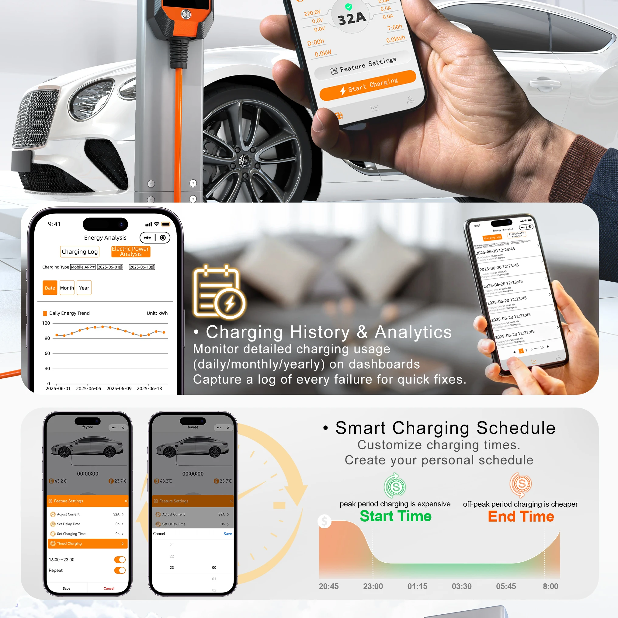 5. Smart Charging Control: Customize via app/charger: schedule start/end times, set delays (1-24h), or specific durations (1-24h) to avoid peak rates. Flexibly adjust amperage (8-32A).