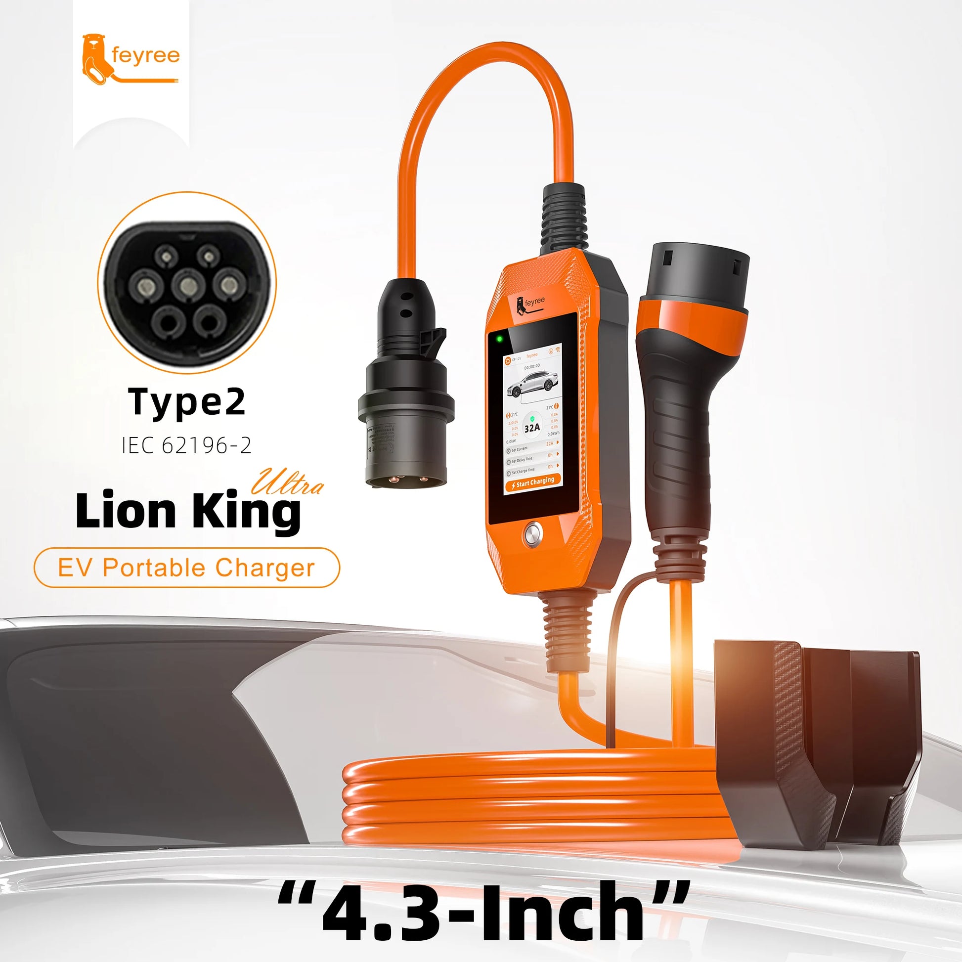 feyree 4.3 inch Touch Screen Type2 7kW 32A Adjustable Portable EV Charger with Adapter Smart APP Wi-Fi Control for Electric Cars