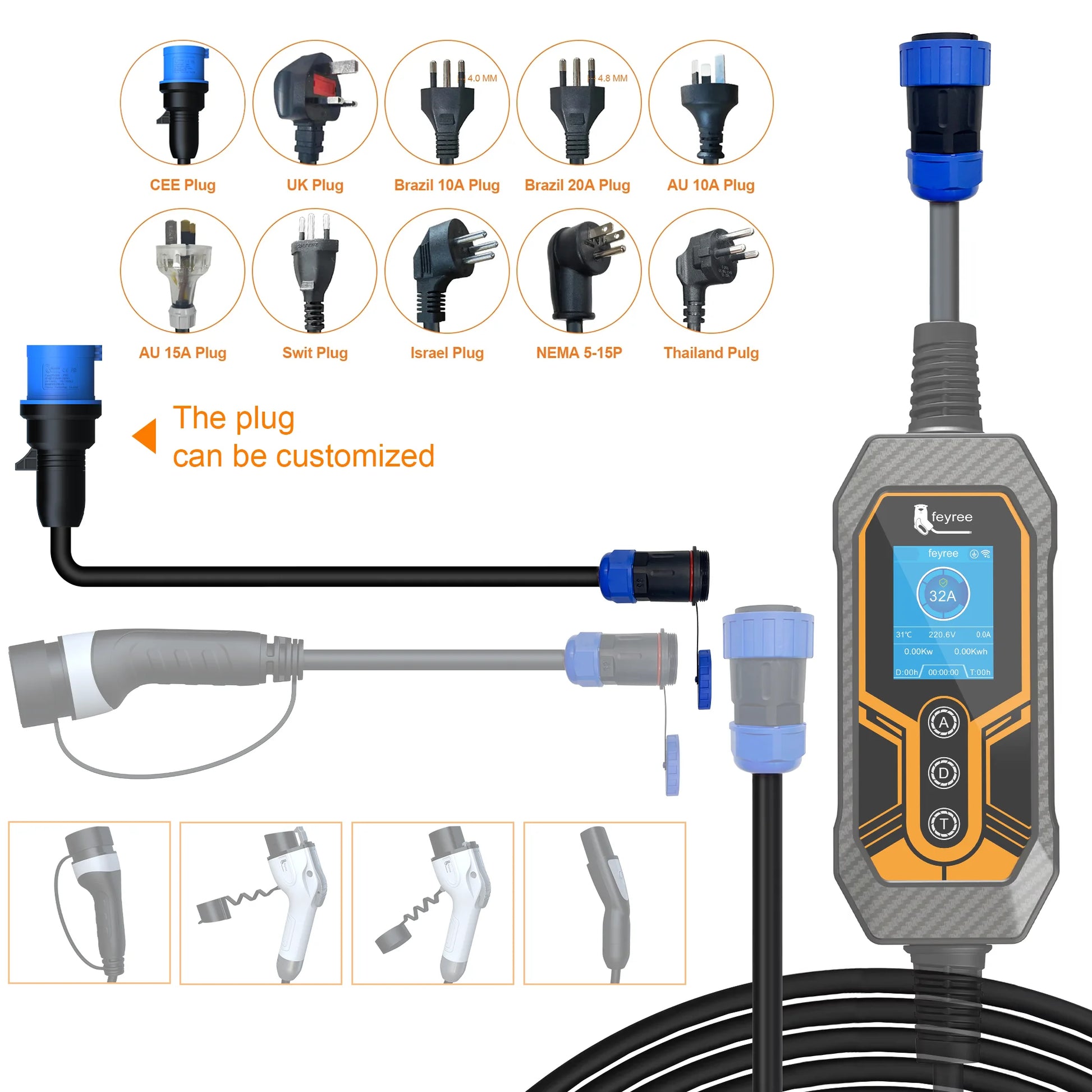 Feyree 7kW Portable EV Charger Replaceable Power Side Plugs Compatible with Multi-Country Charging Standard for Universal Use