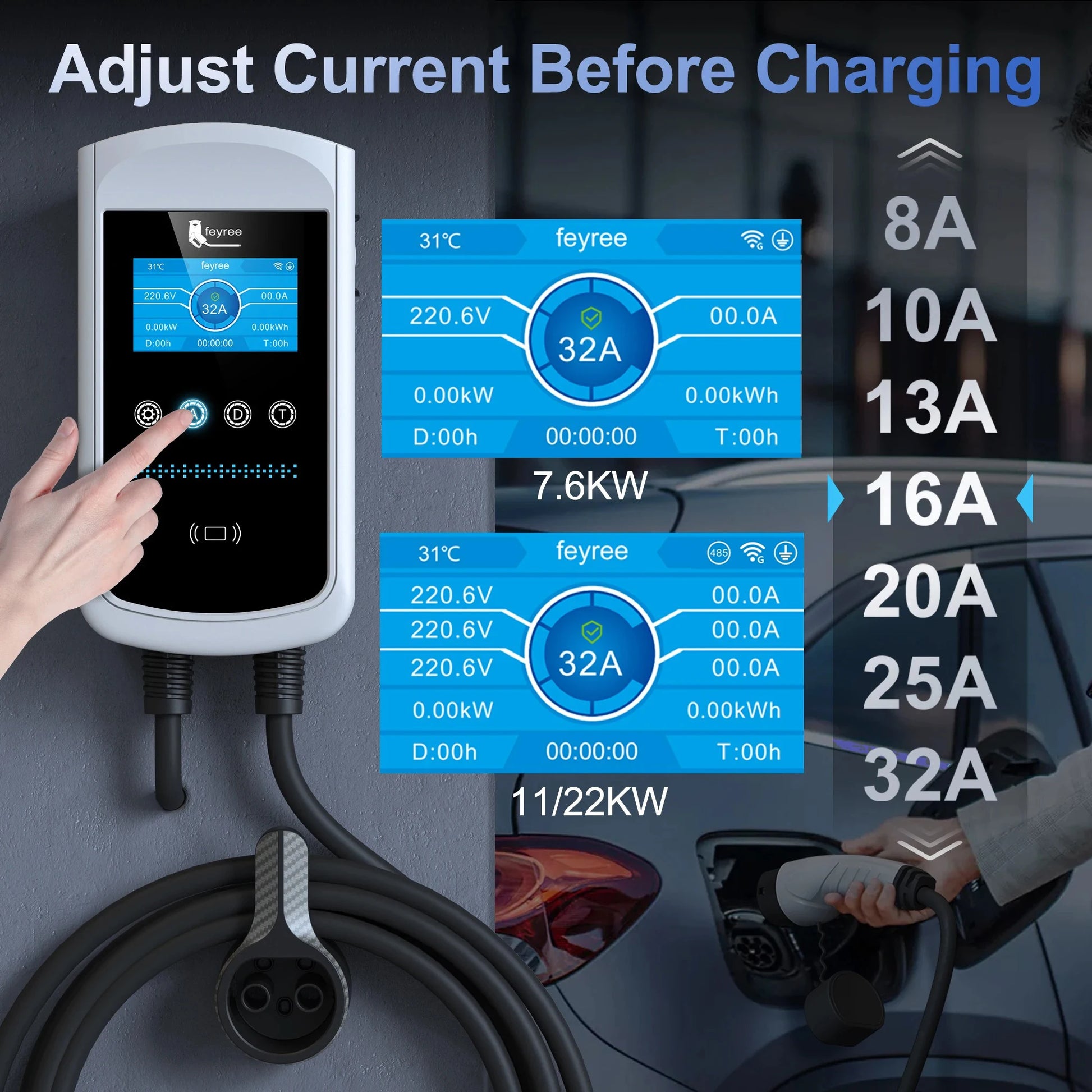 feyree Type2 32A 7kW 1P DLB EV Charger 4.3inch Screen Dynamic Load Balancing 11kW 22kW 3P EVSE Wallbox Station with Charging LOG