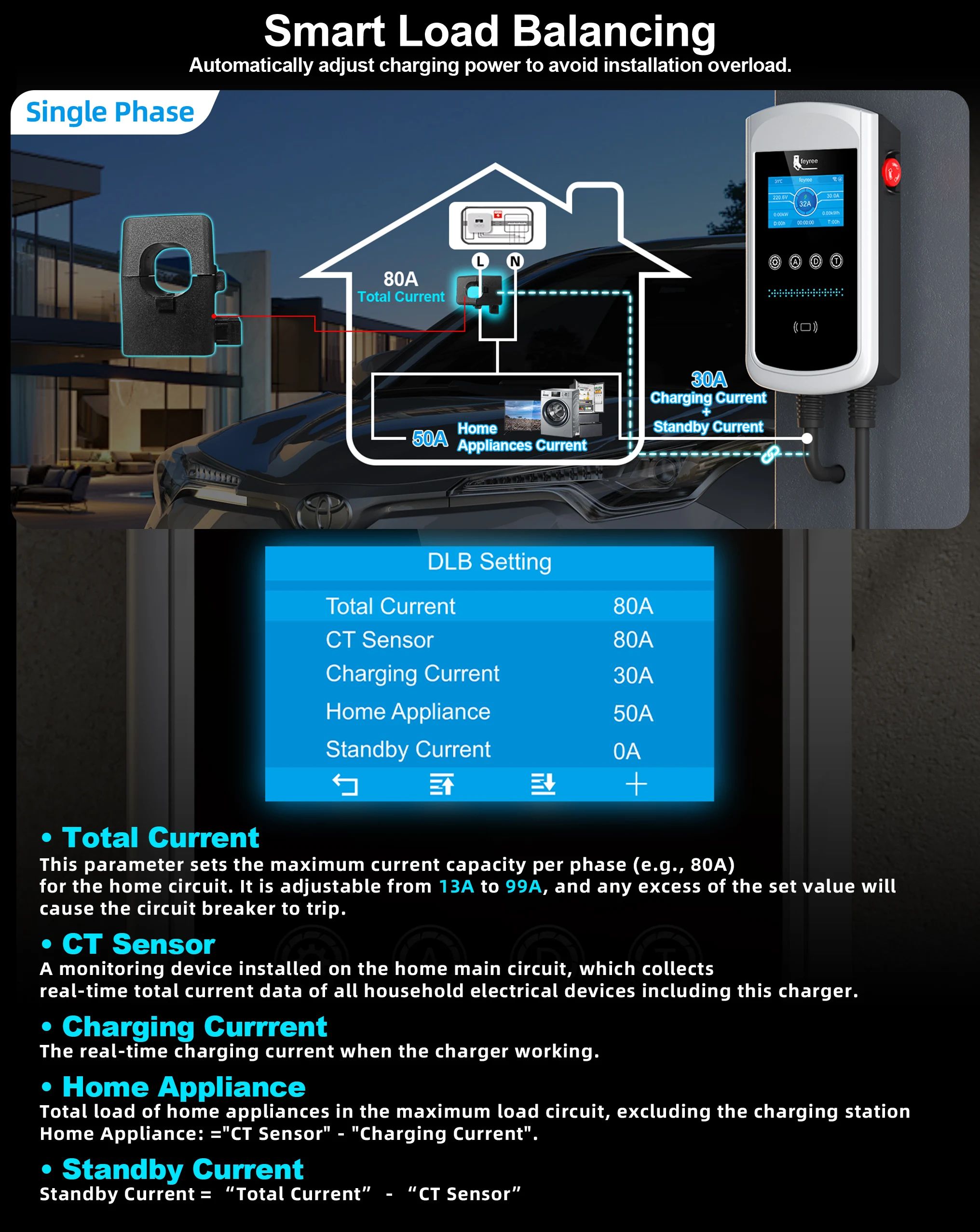 1.Total current set on wallbox - household appliances's current≥8A,The Wallbox will adjust charging current intelligently and charges normally.