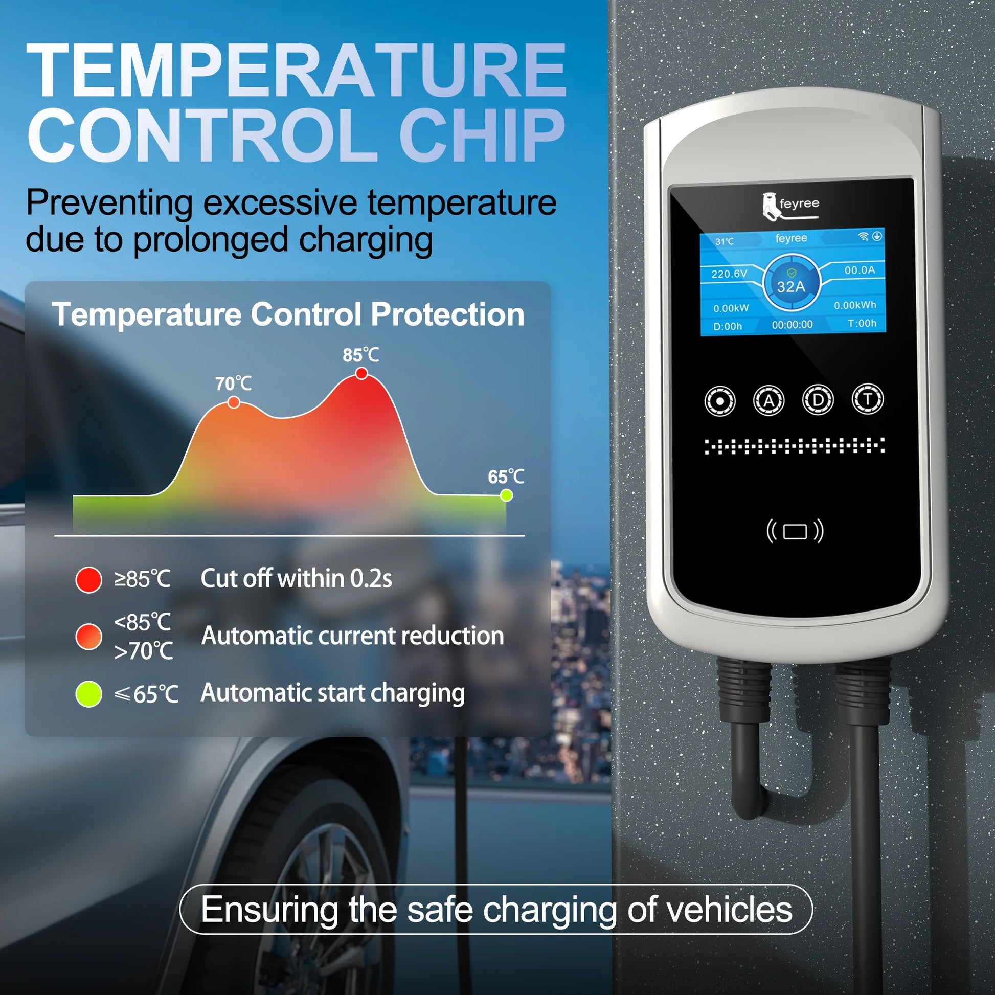 Smart and Intelligent EV Charger:Designed with 4.3 inch big screen which will monitor all the conditions during the charging process including the Voltage, Current and Charging Time.